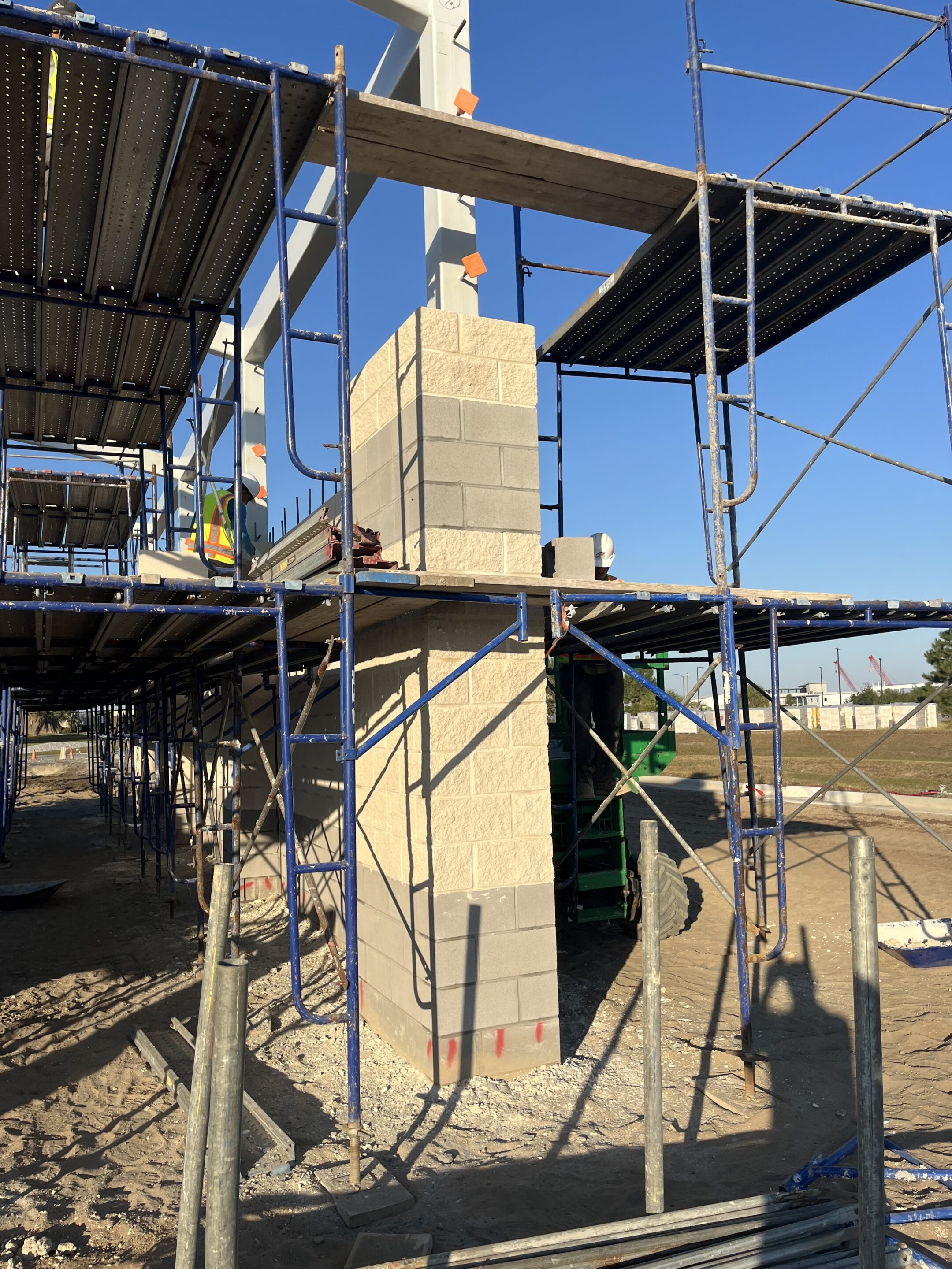 The existing exterior brick of this building was failing and delaminating in several areas throughout this occupied facility and required the selective removal and replacement of only those areas that were failing, Extreme care had to be exercised as not to damage the good bricks to remain or create ruts on the surrounding landscape, as well as not to disturb the ongoing operations of the facility or its occupants. Ameristar’s team of highly skilled masons placed specialized equipment matting on the ground to prevent damage from the heavy equipment required. They then surveyed all of the bricks and marked the failing ones and skillfully removed and replaced them throughout the exterior of the building.